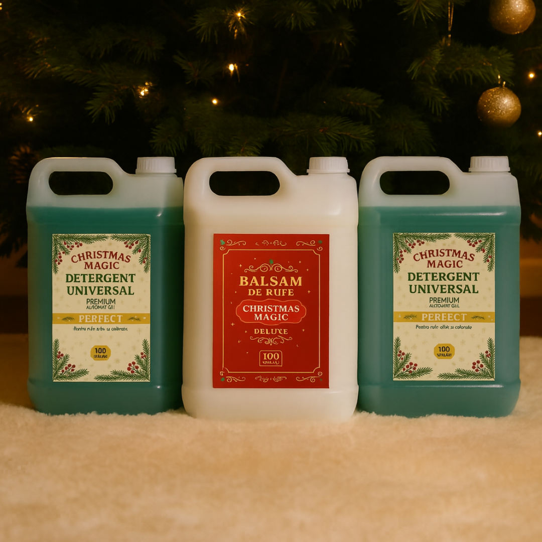 Include 2 x 5 L Detergent Gel Automat Premium Universal – Christmas Magic și 1 x 5 L Balsam de Rufe Extra Parfum – Christmas Magic.